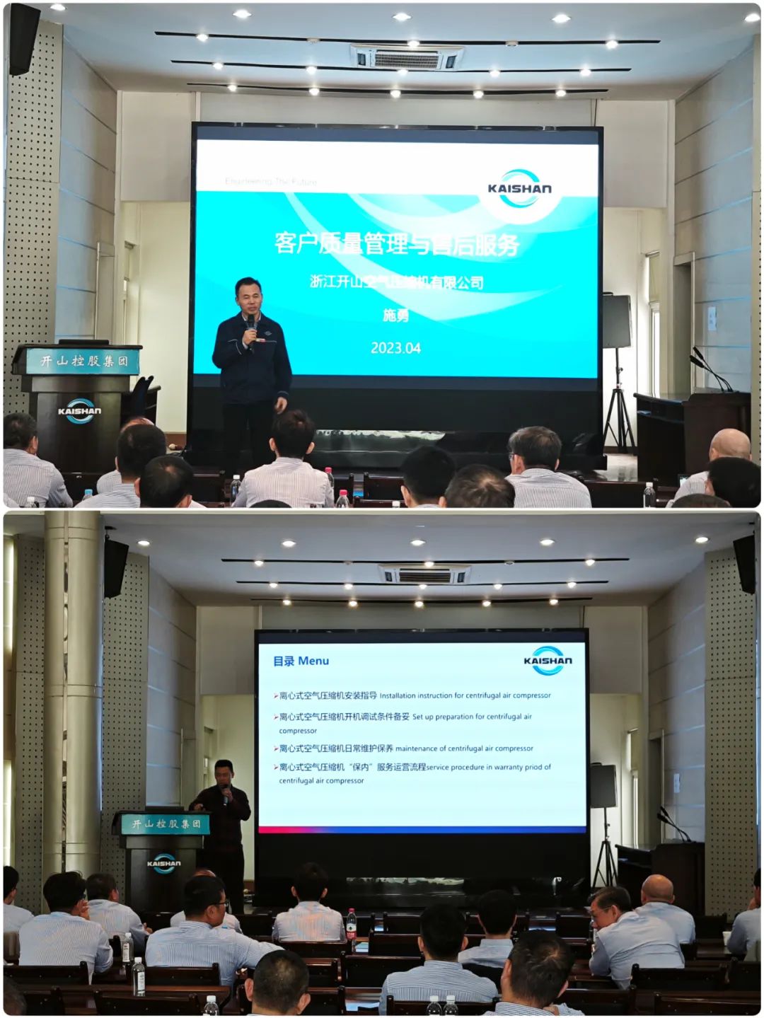 浙江開山壓縮機(jī)有限公司質(zhì)量總監(jiān)施勇做了開山傳統(tǒng)螺桿產(chǎn)品海外市場(chǎng)的支持流程和質(zhì)量提升流程匯報(bào),開山服務(wù)(上海)有限公司總經(jīng)理?xiàng)钷H做了離心機(jī)、PET等產(chǎn)品海外市場(chǎng)服務(wù)管理及服務(wù)培訓(xùn)。